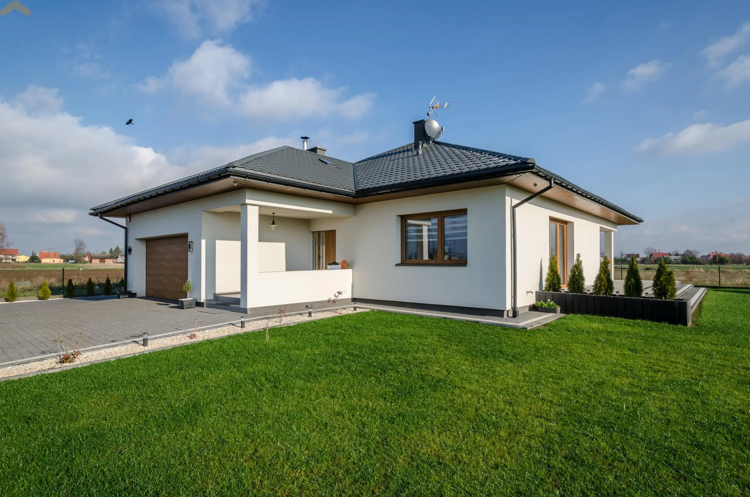 Dom składa się z jasnego i przestronnego salonu połączonego z aneksem kuchennym, sypialni i pokoju dziecięcego oraz łazienki z WC.